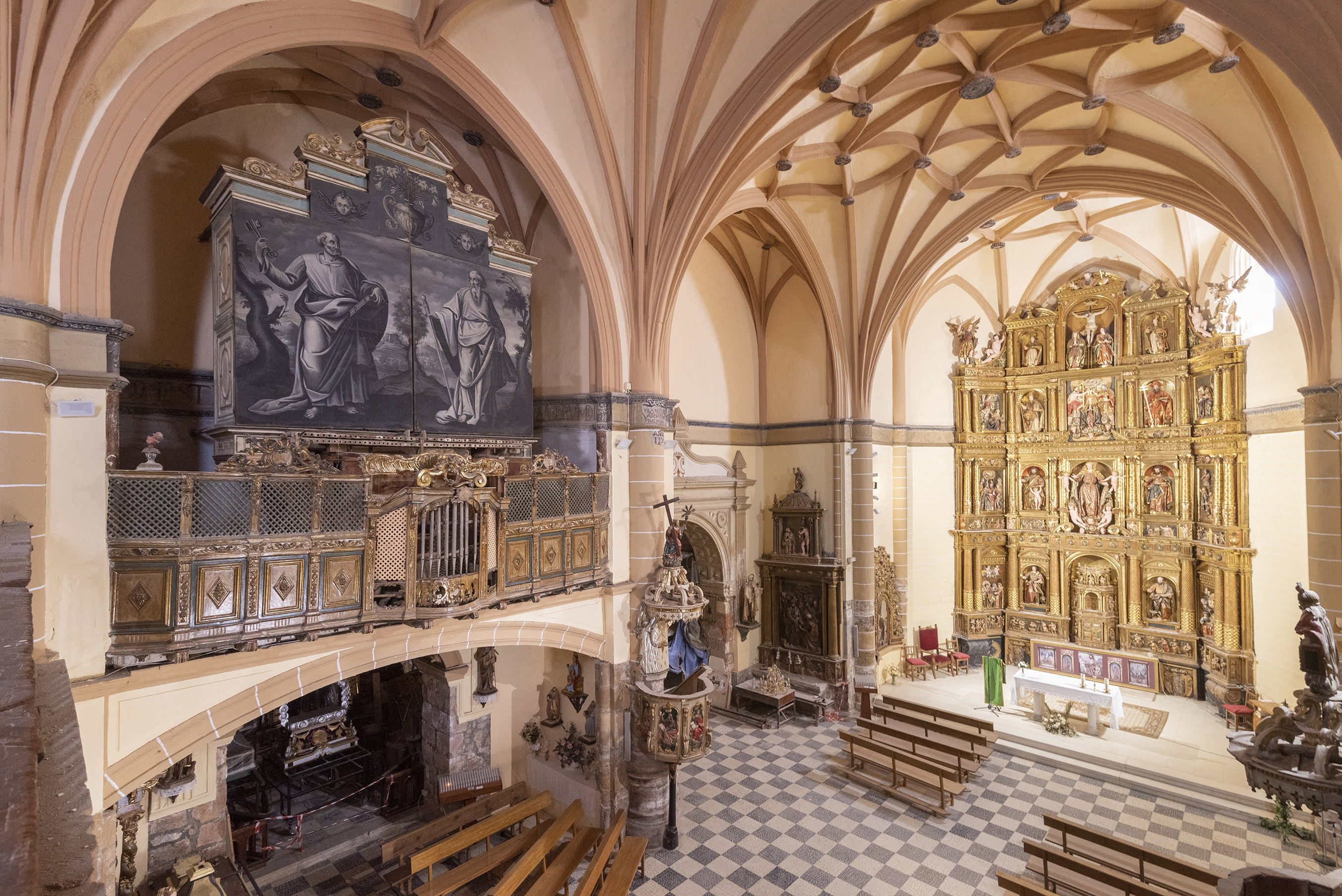 Además del altar mayor, en los ángulos situados entre el presbiterio y las capillas laterales hay otros dos altares, cuyos frentes están decorados con yeserías barrocas (rocallas, tornapuntas) pintadas; en el del lado sur aparece igualmente un escudo, en cuyo cuerpo se representa un monte cimado por una cruz y tres estrellas. Bajo el coro se encuentra la pila bautismal, cuya copa y fuste está decorados con acanaladuras.